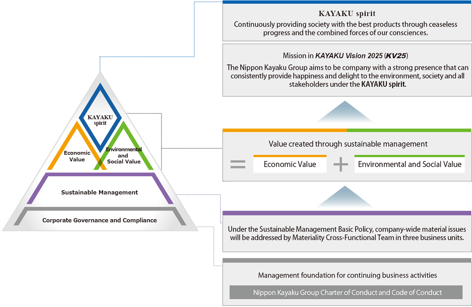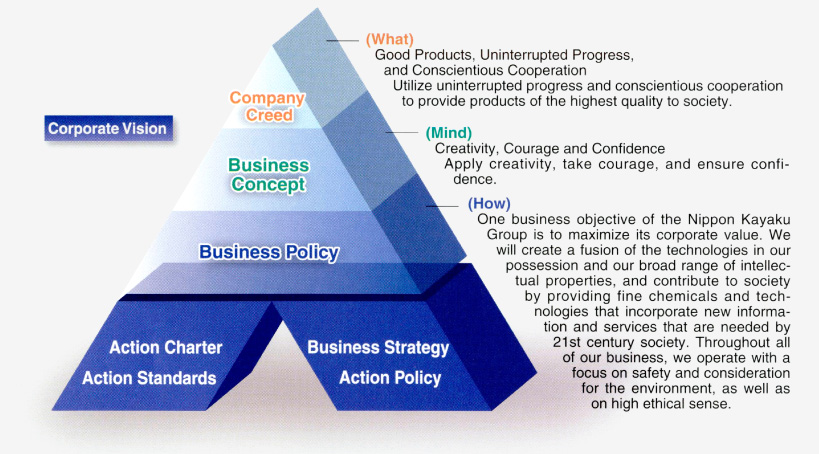 From 2022, under its corporate vision, the KAYAKU spirit, the Nippon Kayaku Group will practice sustainable management that responds to the trust placed in it by all of its stakeholders, by ensuring transparency and fairness in management and contributing to the creation of a sustainable environment and society through its business activities.