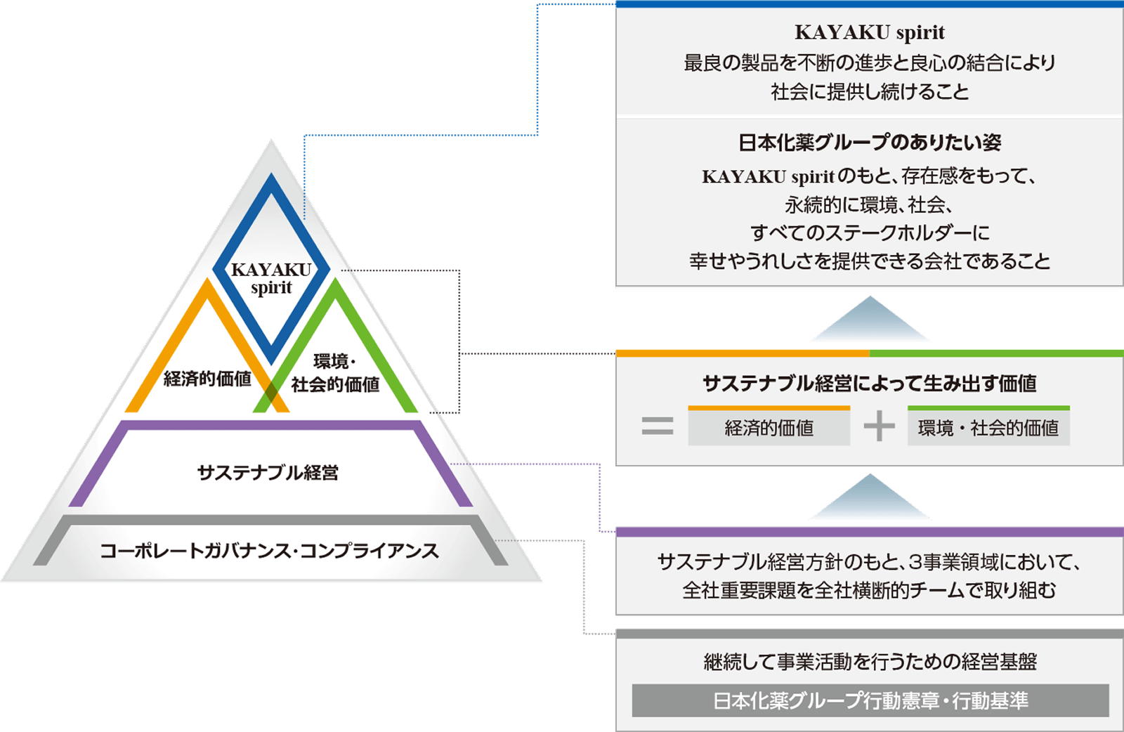 2022年より、KAYAKU spiritのもと、経営の透明性・公正性を確保し、事業活動を通じて持続可能な環境・社会の実現に貢献することで、すべてのステークホルダーの信頼に応えるサステナブル経営を実践しています。