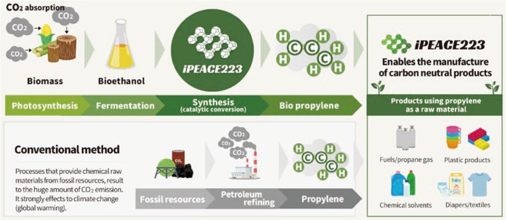 iPEACE223 develops an innovative catalyst and process for high-efficiency, low-cost production of propylene—a raw material for plastics and synthetic fibers—from bioethanol, a fuel additive that is widely used worldwide. This “green propylene” has the potential to significantly contribute to decarbonization across the supply chain as a fuel and as a raw material for acrylic acids and methacrylic acids, which are also part of our business.