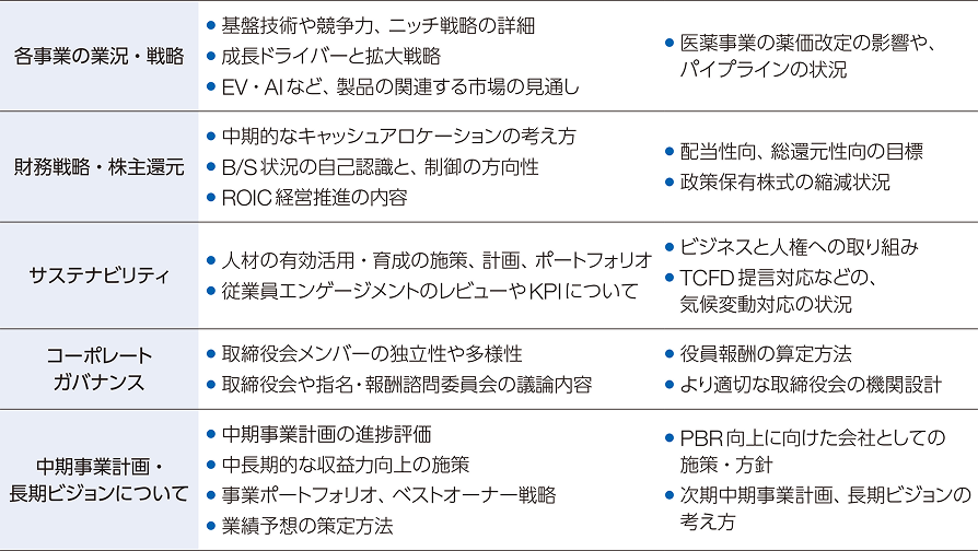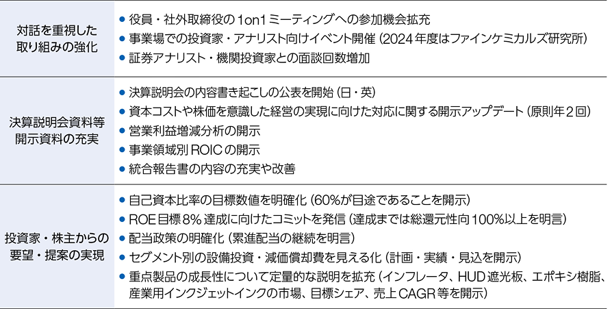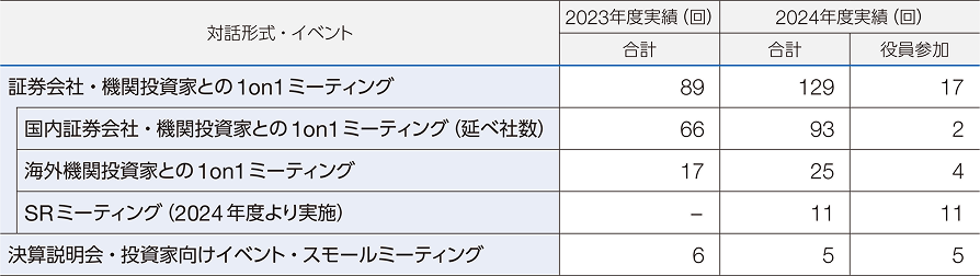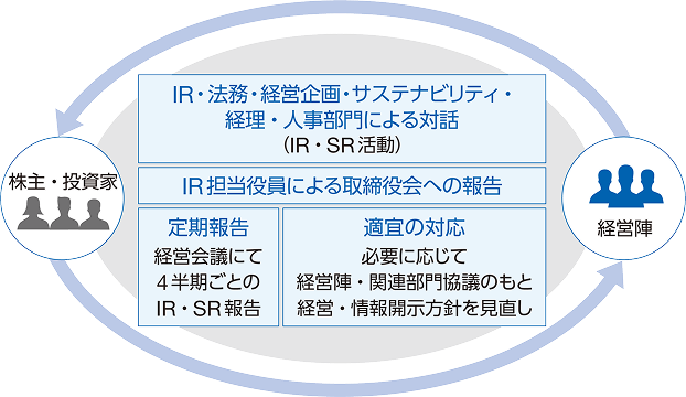 また、対話を通じて得られた株主・投資家のみなさまの関心事項やご意見は、経営陣や関連部署の責任者と共有し、経営判断に反映させることが重要であると考えています。さらに、株主・投資家のみなさまのリスク回避と健全な株式市場の形成に貢献するため、インサイダー取引の防止にも継続的に取り組んでいます。