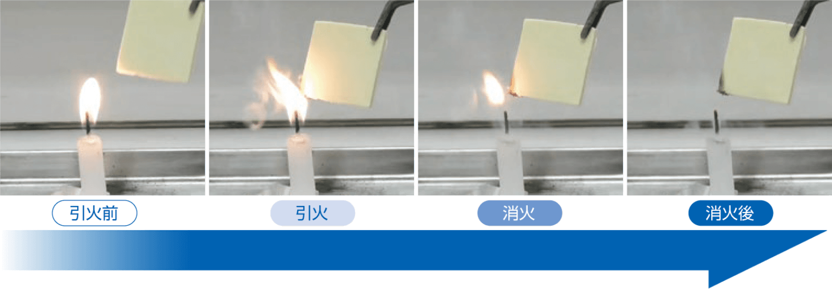 火炎へ当社の開発した消火シートを近づけることで、カリウムラジカルの負触媒効果によって迅速な消化が可能